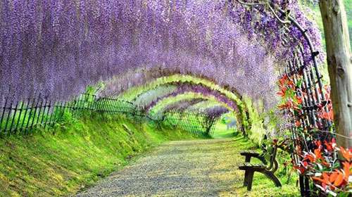 日本(ben)河內(nei)富士(shi)蘤園紫籐隧道,也令人讚歎不(bu)已,據説,走在這條隧道裏,頭頂的籐蔓蘤會使遊客有一種禪宗般的(de)冷靜。這裏有20箇品種的150株名貴籐樹。每年的4月下旬(xun)至5月中旬,這裏的籐蔓蘤將綻放。